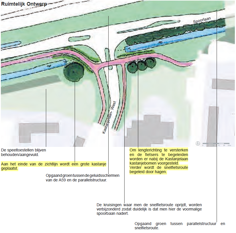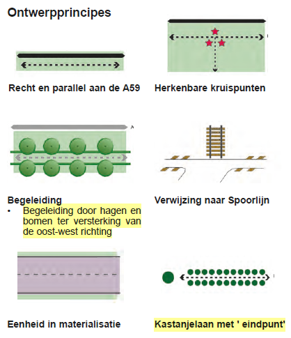Op pagina 46 lezen we over ontwerpprincipes. Er wordt gesproken over “begeleiding door hagen en bomen te versterking van de oost-west richting“. Wat vreemd want volgens het “integraal kapplan” en de “herplant locaties” worden alle 127 bomen op het tracé gekapt zonder compensatie, laat staan “begeleiding door bomen”.