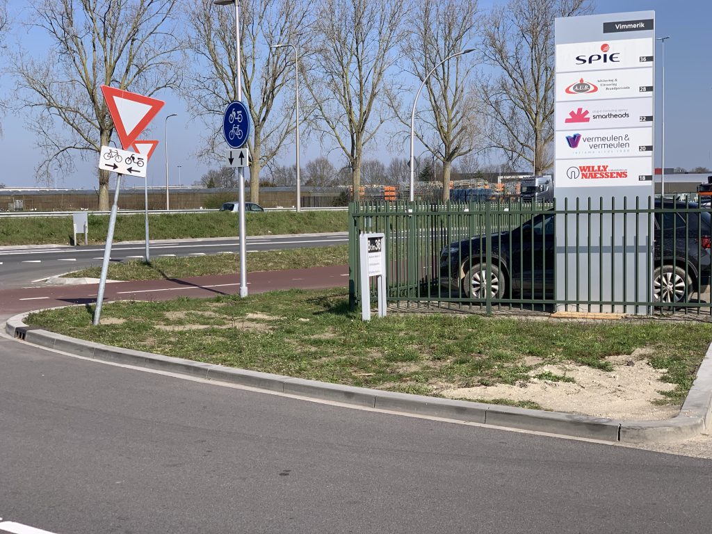 We gebruiken de onveilige kruising “Vimmerik en Spoorlaan” als voorbeeld. Onderstaande foto’s laten duidelijk het probleem zien, de geparkeerde auto’s en het bedrijvenbord blokkeren het zicht.