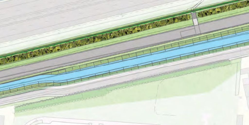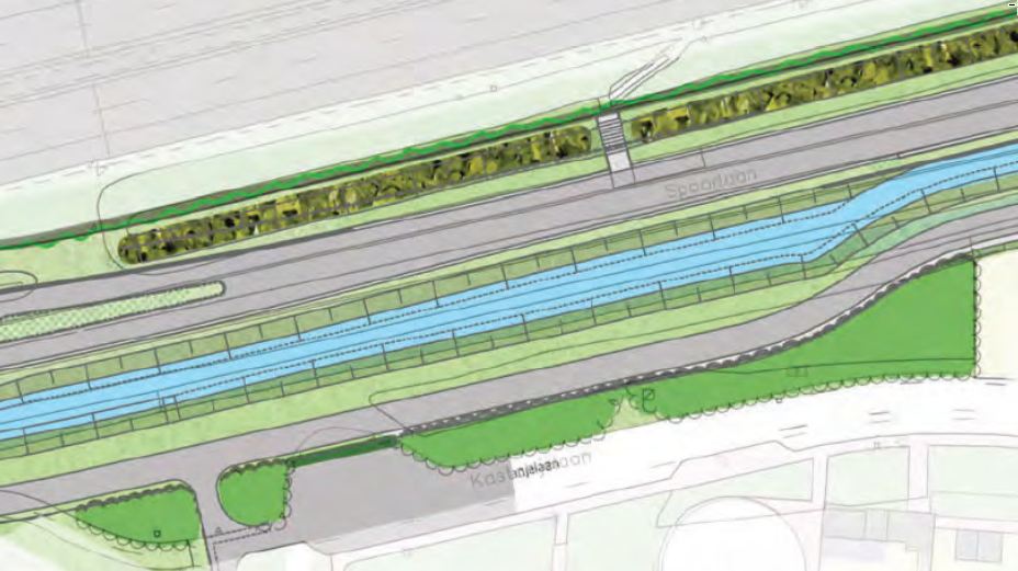 - Om het fietspad hier in te passen wordt de watergang opgeschoven richting de Spoorlaan. Aan de wegzijde wordt de watergang voorzien van een damwand